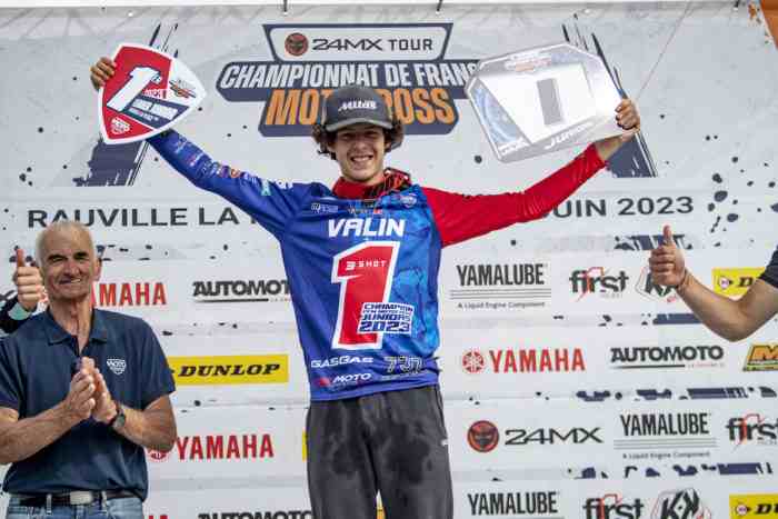 Après une première journée ensoleillée, la météo est venue bouleverser l’épreuve de Rauville-la-Place. Quelques minutes avant la première manche Junior, un déluge s’abat sur la piste normande. Arrivé sur place avec 64 points d’avance sur Mathis Barthez, Mathis Valin doit marquer 11 unités de plus que le pilote Yamaha pour décrocher le titre à l’issue du premier débat. Auteur du holeshot, intouchable dans la boue, le pilote GasGas 737 Performance rempli sa mission et remporte sa onzième manche consécutive. À la lutte pour la place de Vice-Champion, Mathis Barthez et Jules Piètre abandonnent. Le premier après avoir chuté, le second à la suite d’un problème mécanique. De retour de blessure, Tom Brunet termine second devant Jean-Paul Piacentini, Tom Caneele et Noa Houque. Avec cette victoire, Valin décroche donc le titre de Champion de France Junior 2023.