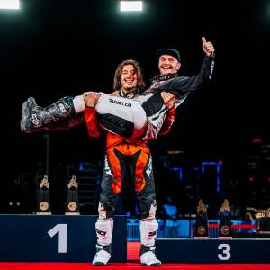 Très mal parti, le leader du championnat Hugo Blanjoue (Elite Moto 15 – KTM) a dû batailler fort pour remonter petit à petit le temps perdu dans le premier tour. Des efforts qui lui permettent de limiter un peu la casse en prenant tout de même une place sur le podium, il est troisième ce soir. David Abgrall (Atomic Moto – Husqvarna), auteur d’une très belle fin de course, a su magistralement résister au retour de Blanjoue, notamment en s’imposant dans l’ultime chrono. C’est lui qui monte sur la seconde marche du podium ce soir.