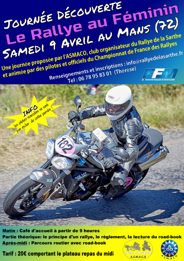 Venez découvrir le Rallye Routier lors d'une journée ouverte organisée par l'ASM ACO, club organisateur du Rallye de la Sarthe, en partenariat avec le Comité de Promotion de la Moto au Féminin de la Fédération Française de Motocyclisme.