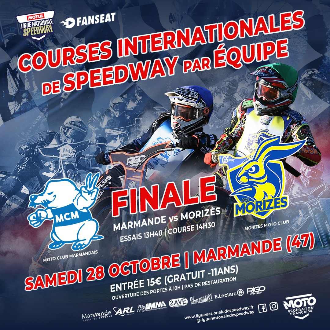 Le samedi 28 octobre prochain, le Moto-Club Marmandais accueillera la Finale de la Ligue Nationale Speedway Motul 2023 qui opposera Marmande à celle de Morizès, et tous les compteurs seront remis à zéro !