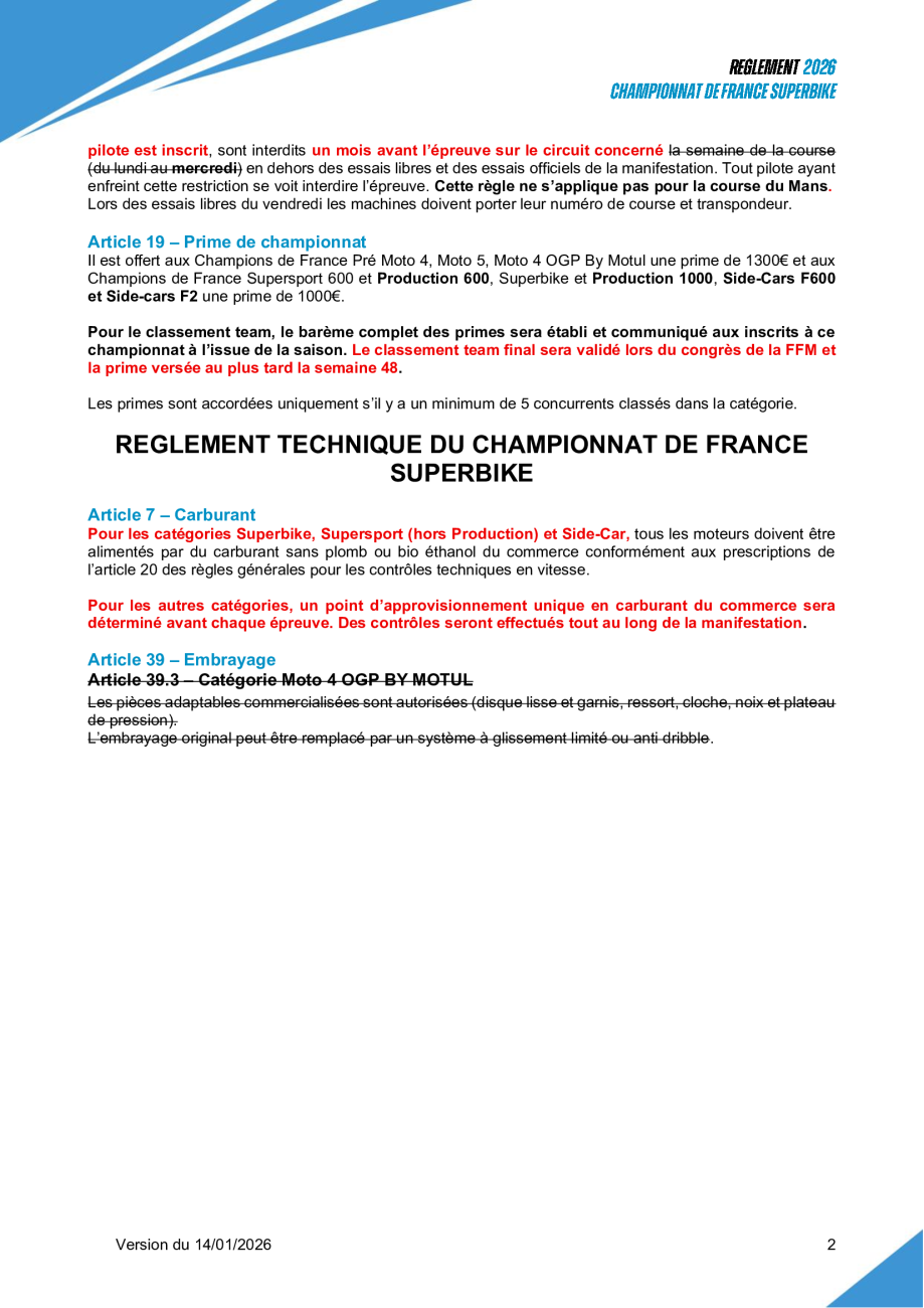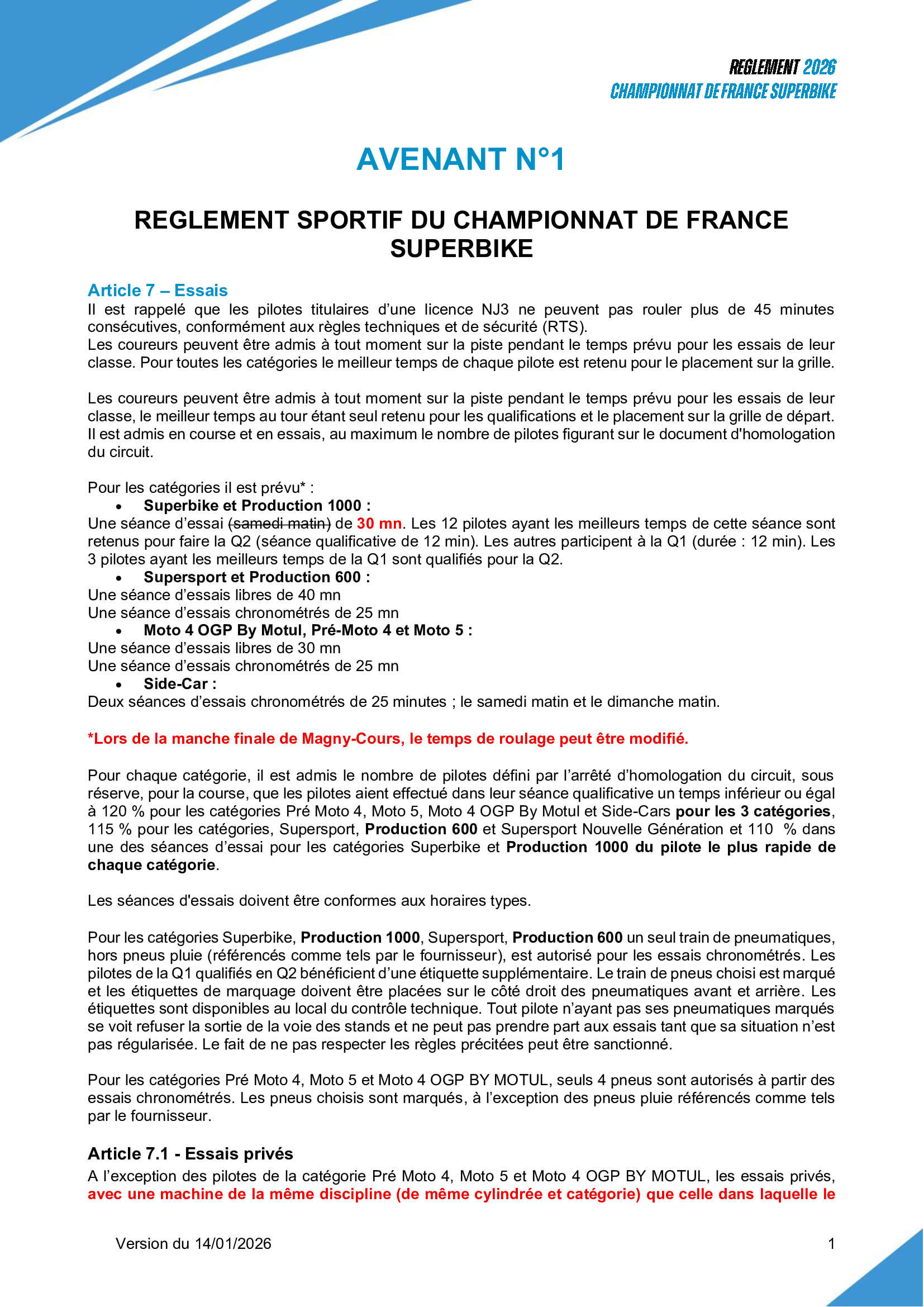 Avenant 1 - Règlement Championnat de France Superbike 2026