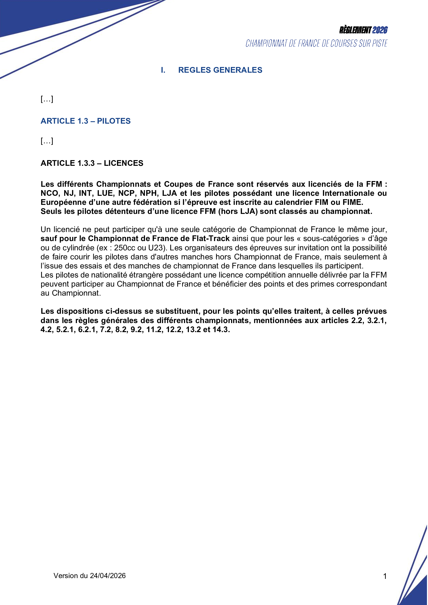 Avenant n°1 - Reglement Championnat de France de Courses sur piste 2026