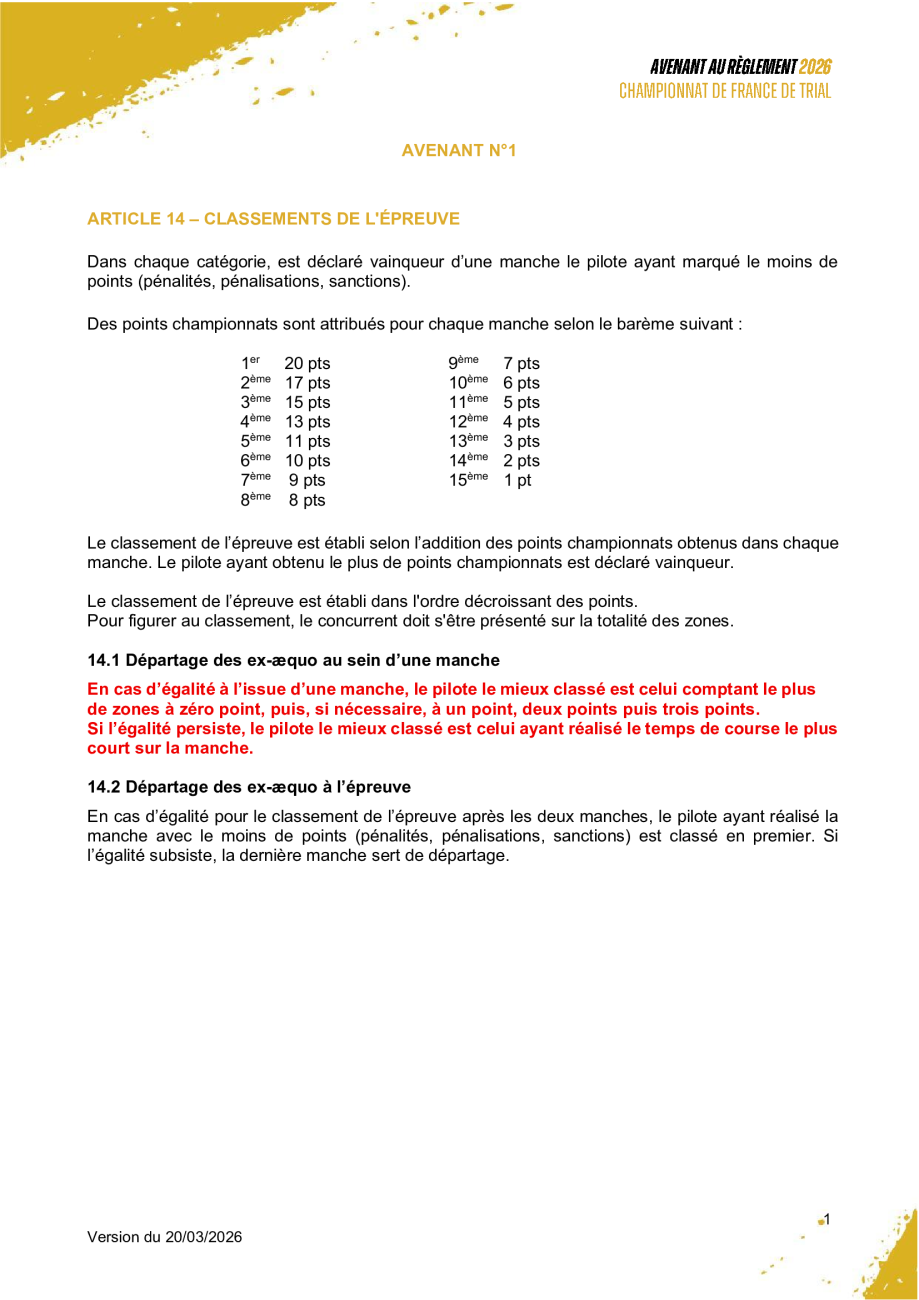Avenant n°1 - Règlement Championnat de France de Trial 2026