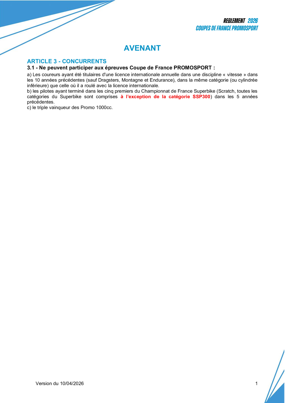 Avenant - Règlement des Coupes de France Promosport