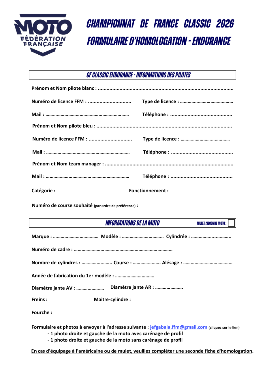 Formulaire d'homologation CF Classic - Endurance