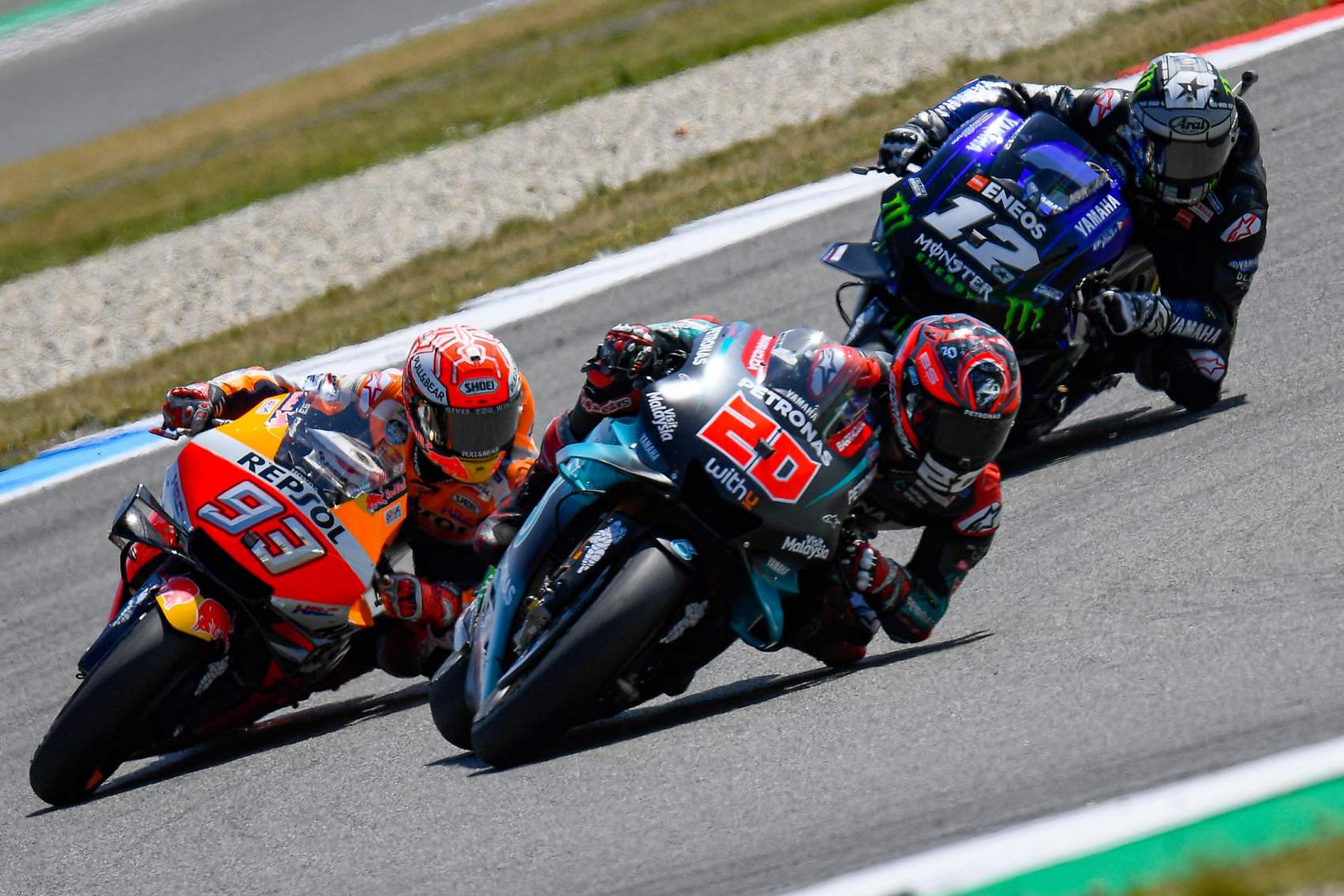 Fabio Quaratararo - Yamaha devant Marc Marquez - Honda et Maverick Viñales - Yamaha (photo Yamaha Racing)