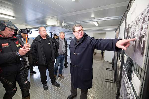Jacques Bolle commentant l’exposition photos retraçant l’histoire du circuit devant Philippe Guérin (FFMC).