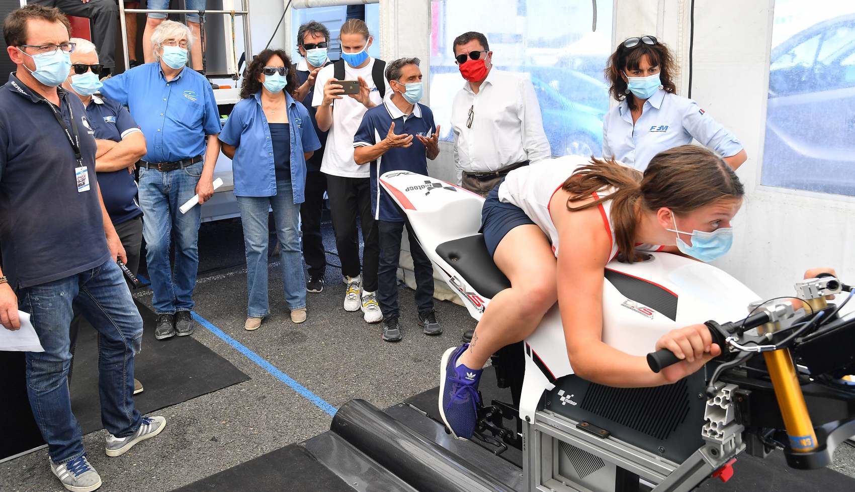 Jacques Bolle - Président de la Fédération Française de Moto avec les Elus autour du simulateur moto de la société DVS (photo FFM)