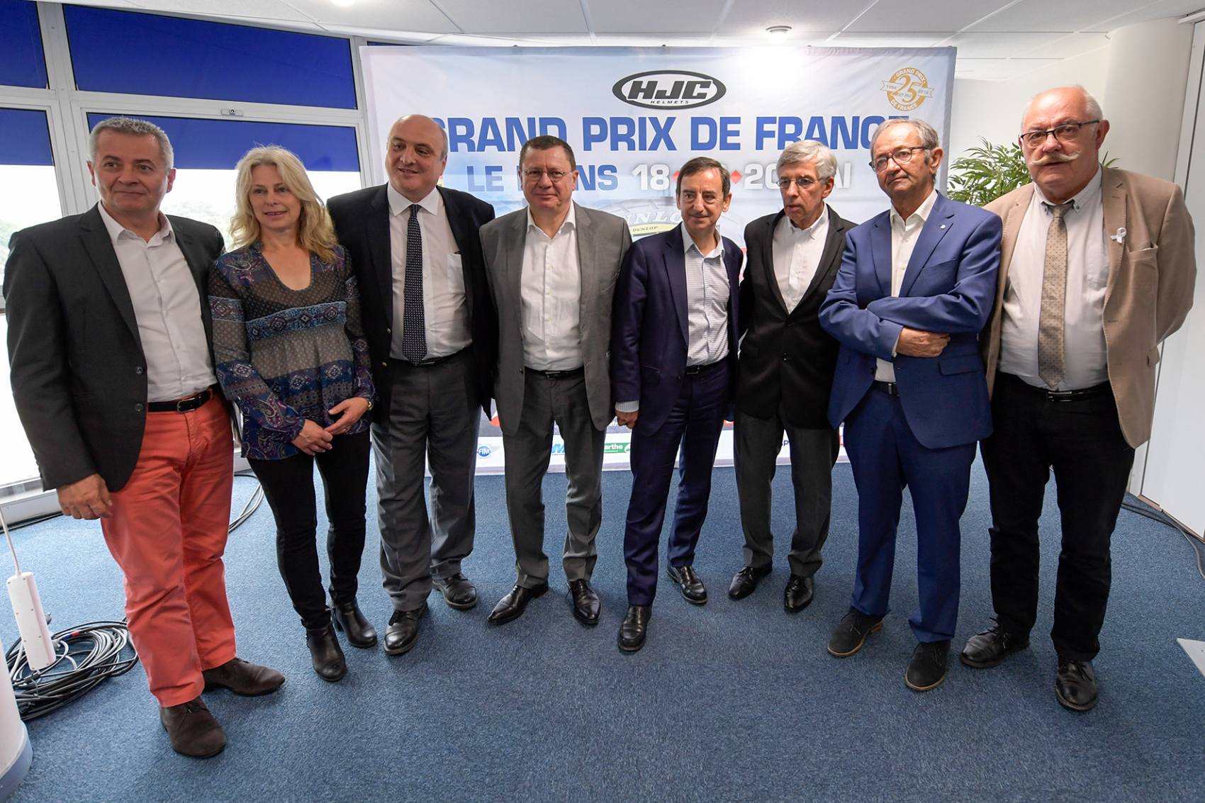 Jacques BOLLE - Président de la FFM, Pierre FILLON - Président de l'ACO et Claude MICHY - Promoteur du Grand Prix de France), entourés des représentants des collectivités Ville du Mans, département de La Sarthe et région Pays de la Loire (photo PHA)
