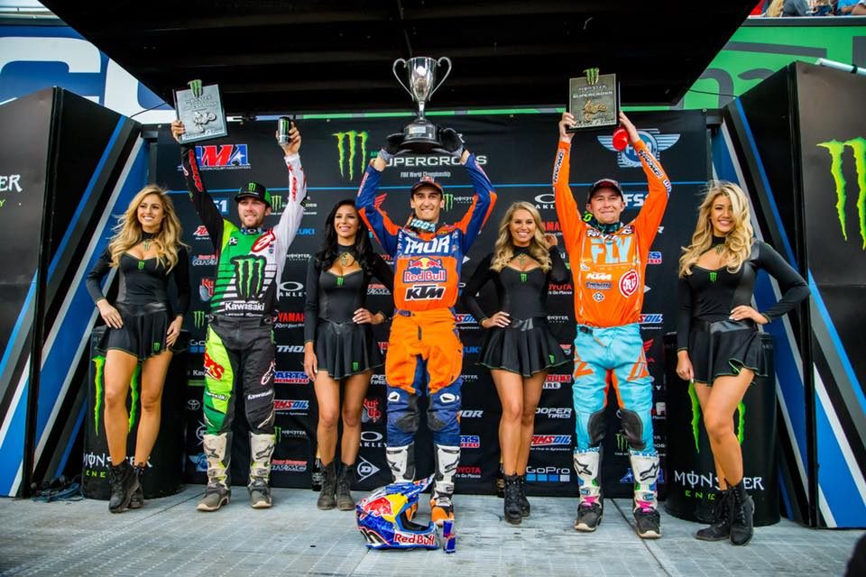 Podium 450SX : Eli Tomac - Kawasaki, Marvin Musquin - KTM et Blake Baggett - KTM (photo Monster Energy Supercross)