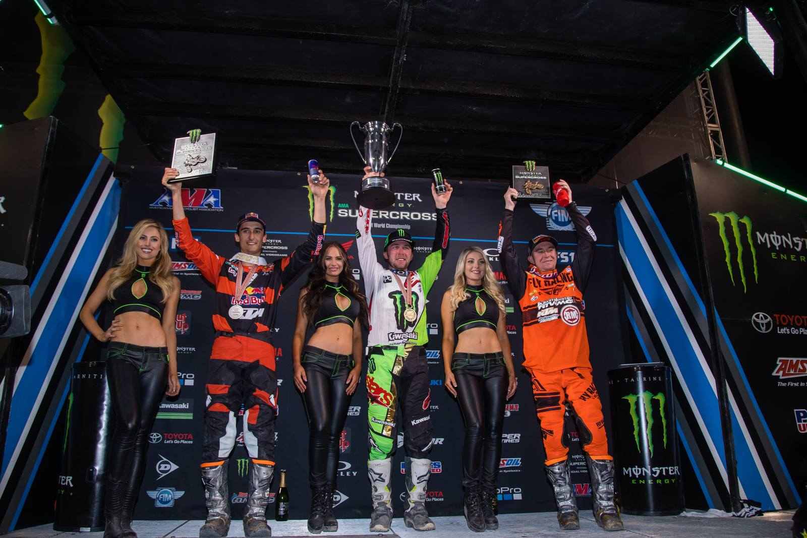 Podium 450SX : Marvin Musquin - KTM, Eli Tomac - Kawasaki et Black Baggett - KTM (photo AMA Supercross)