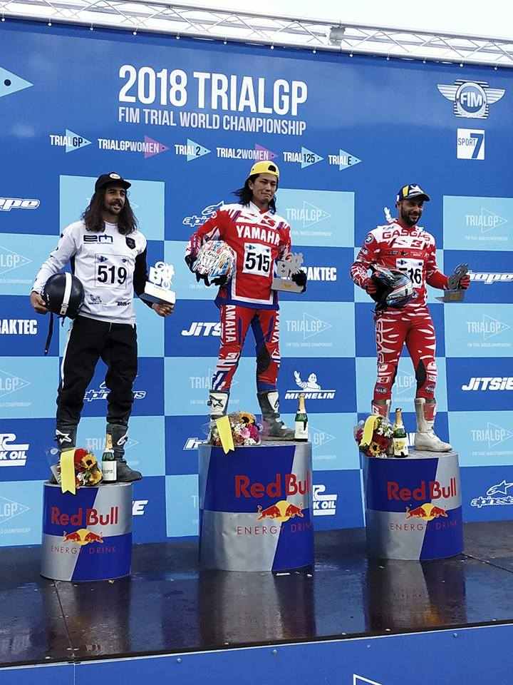 Podium E-Trial : Christophe Bruand - Electric Motion, Kenichi Kuroyama - Yamaha et Loris Gubian - Gas Gas (photo TrialGP.com)