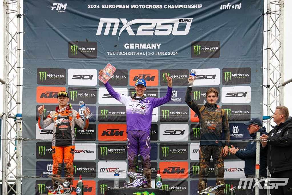 Podium EMX250 : Maxime Grau - KTM, Mathis Valin - Kawasaki et Cas Valk (photo mxgp.com)
