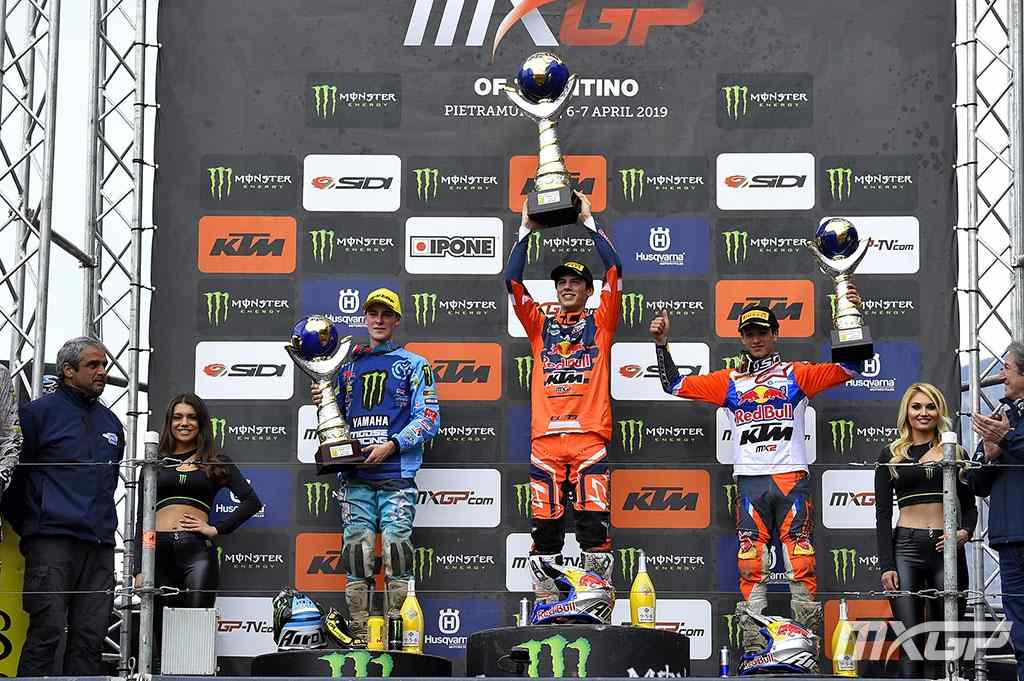 Podium MX2 : Jago Geerts - Yamaha, Jorge Prado - KTM et Tom Vialle - KTM (photo MXGP.com)
