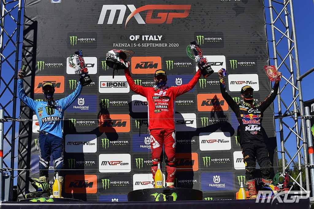 Podium MX2 : Jago Geerts - Yamaha, Maxime Renaux - Yamaha et Tom Vialle - KTM (photo mxgp.com)