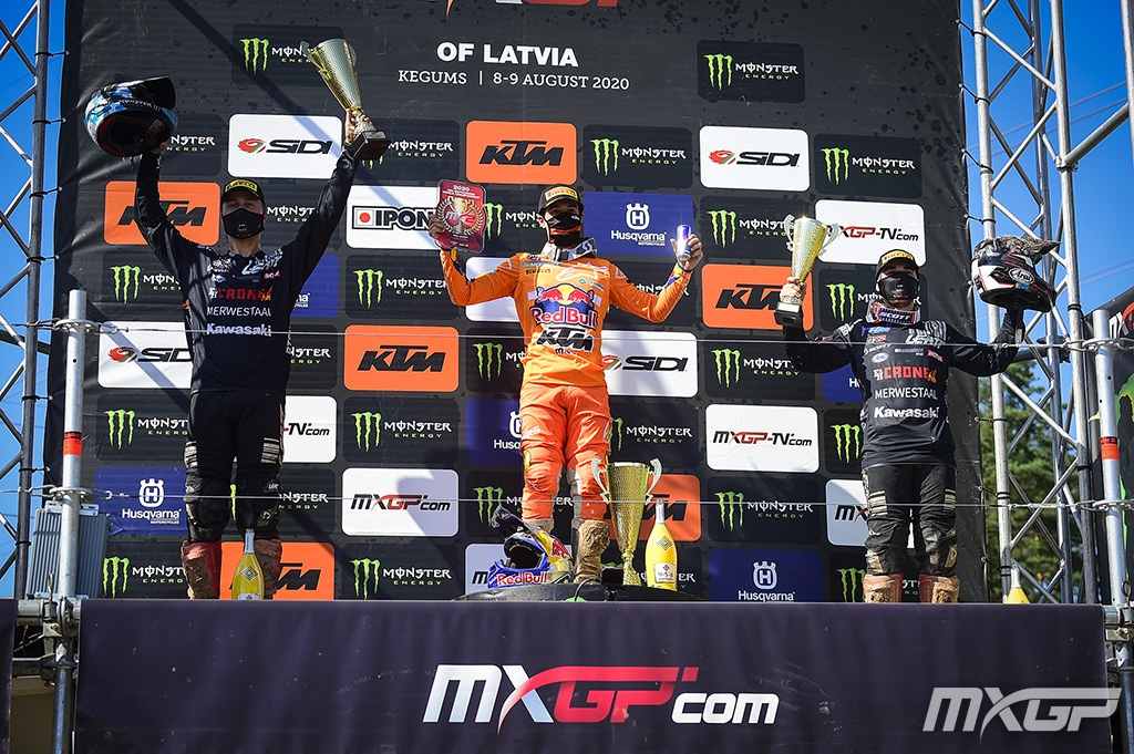 Podium MX2 : Roan Van De Moosdijk - Kawasaki, Tom Vialle - KTM et Mathys Boisramé - Honda (photo mxgp.com)