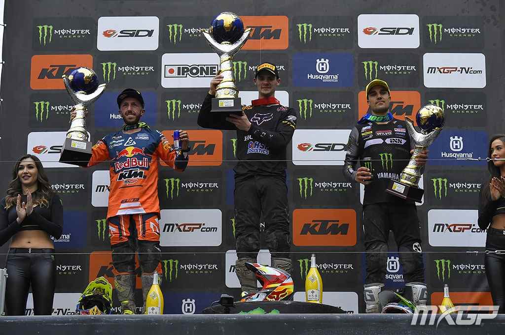 Podium MXGP : Antonio Cairoli - KTM, Tim Gajser - Honda et Gautier Paulin - Yamaha (photo MXGP.com)