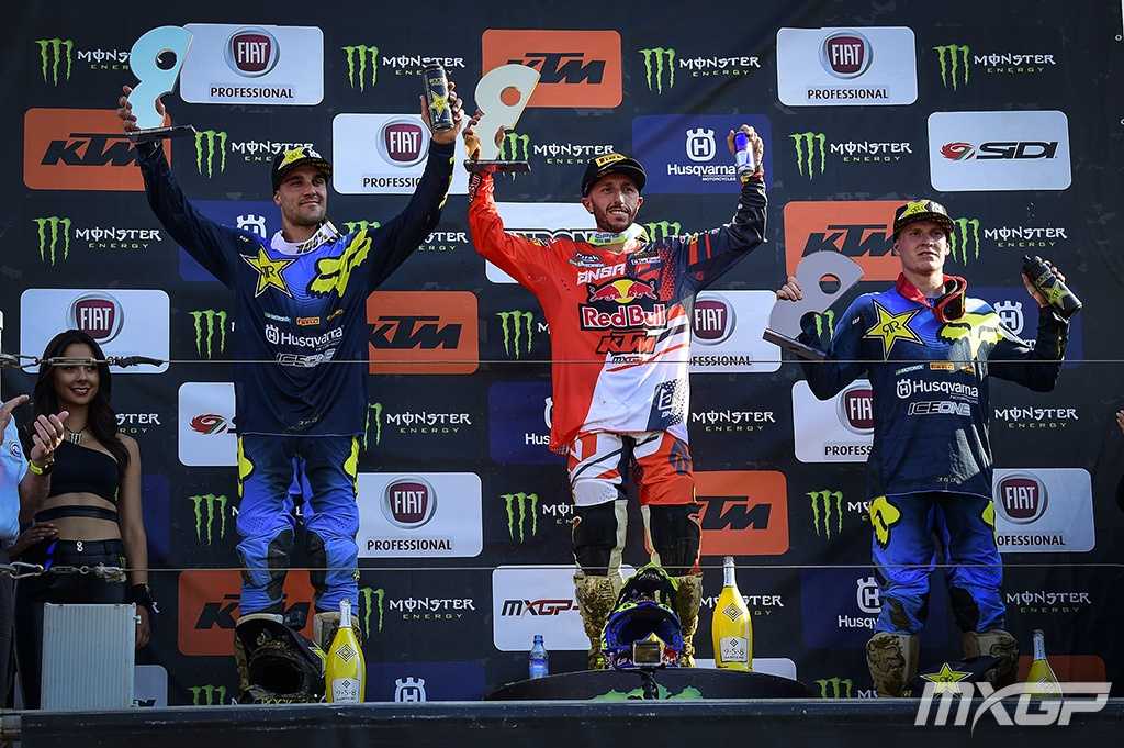 Podium MXGP : Gautier Paulin - HVA, Toni Cairoli - KTM et Max Anstie - HVA (photo MXGP)