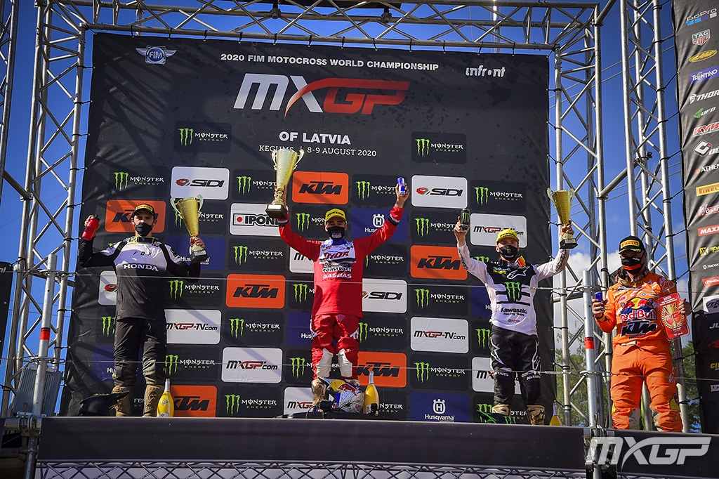 Podium MXGP : Tim Gajser - Honda, Glenn Coldenhoff - GasGas et Romain Febvre - Kawasaki (photo mxgp.com)