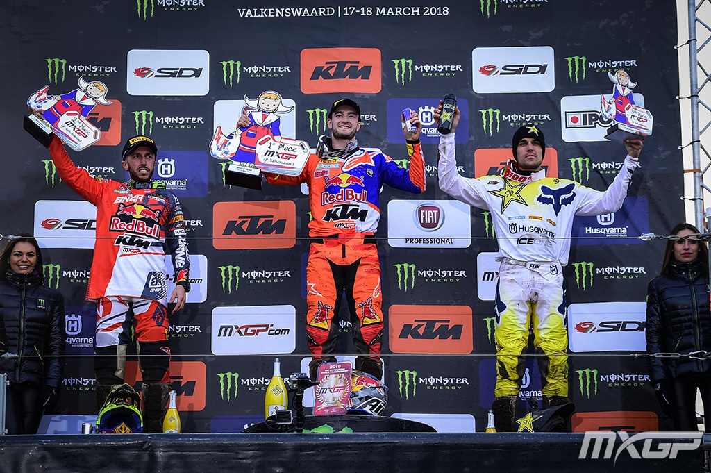 Podium MXGP : Toni Cairoli - KTM, Jeffrey herlings - KTM et Gautier Paulin - HVA (photo MXGP)