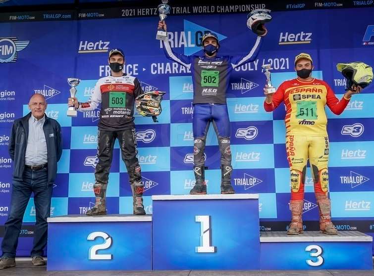 Podium TrialE : Julien Perret, Gaël Chatagno - Electric Motion et Martin Riobo Hermelo - Electric Motion (photo TrialGP/Pep Segales)